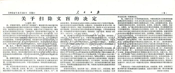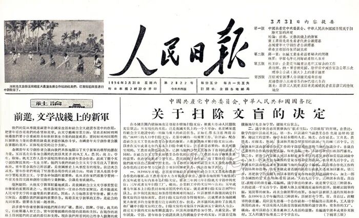 1956年3月31日,《人民日报》刊登的《关于扫除文盲的决定》。 中央档案馆藏